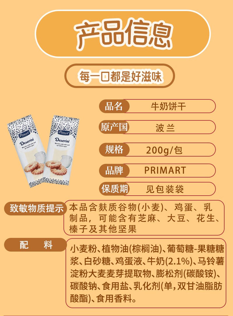 商品名称:波兰进口PRIMART牛奶饼干 200g